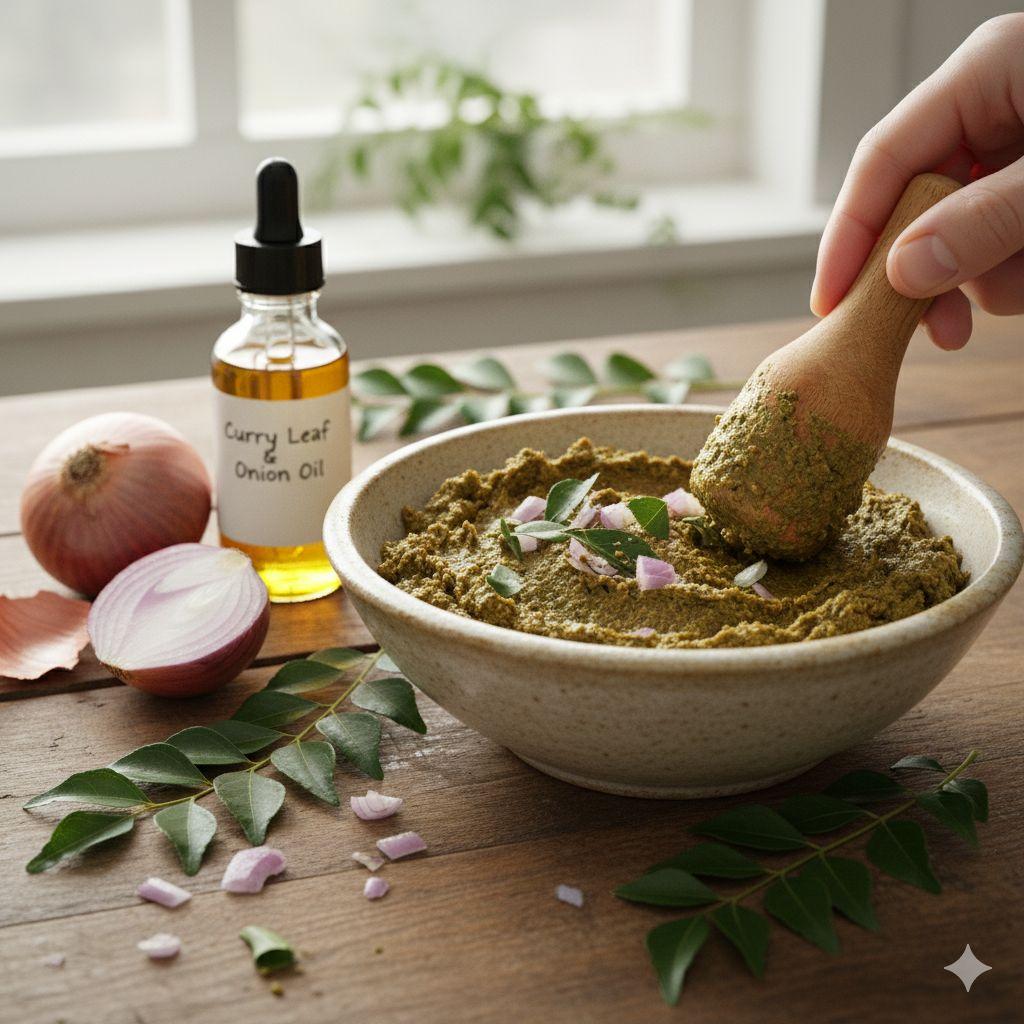प्याज़ में मौजूद सल्फ़र केराटिन के निर्माण में मदद करता है, जिससे नए बाल उगते हैं। वहीं करी पत्ते में मौजूद एंटीऑक्सीडेंट्स बालों को जड़ से मज़बूत बनाते हैं और समय से पहले सफेद होने से रोकते हैं।